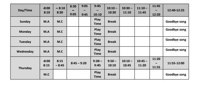 • KG Daily Class Schedule and Breaks